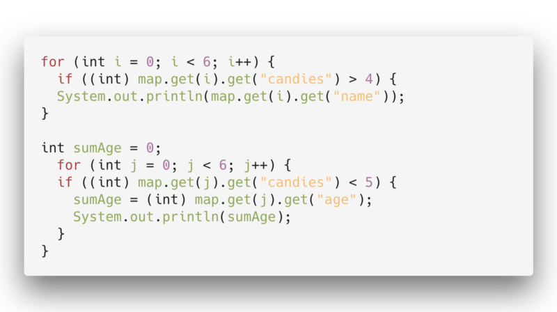“Display the following things: Who has got more candies than 4 / Sum the age of people who have less than 5 candies”