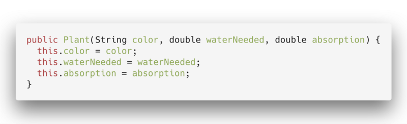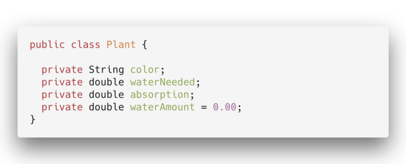 Let’s get back to the garden example… when we create a Plant class, we create field variables, such as the ones listed below.