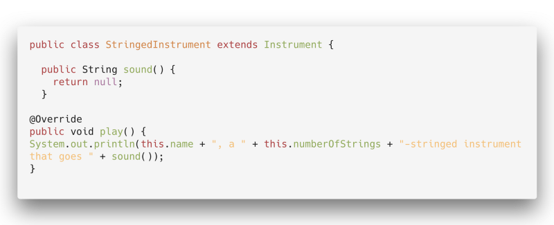 Polymorphism is the ability to take new forms. Remember the inheritance principle we talked about above? Now imagine a parent class has a method that is common to all its children classes but specific to each one. What would we do? Something like this?