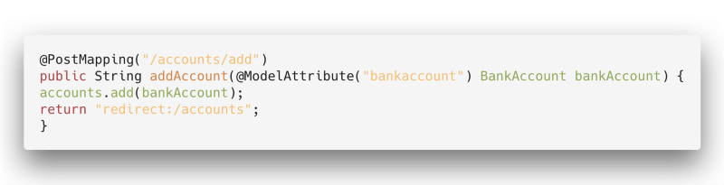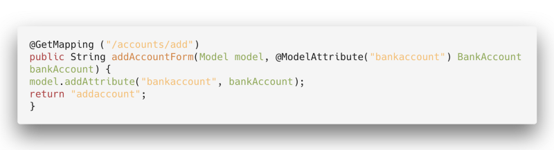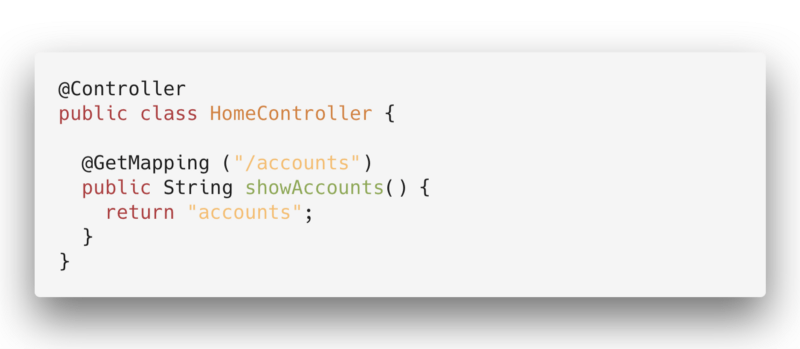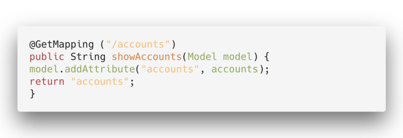 The @GetMapping(“/accounts”) is our first endpoint (put very simply, what we have to write in our browser to get this View). And when we return “accounts”, we are displaying an HTML document with that name.