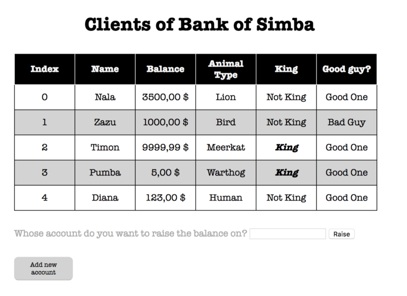 In order to explain the topics that we covered these weeks, I will take one of the exercises we completed, where the goal was to create the Bank of Simba, a Lion King based bank account application that would display information about the customers, allow to update the balance and add new accounts. The final result will look like this: