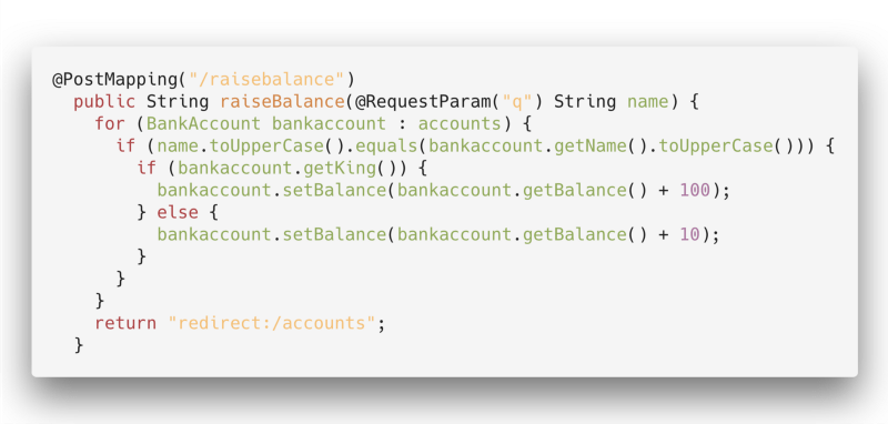 This form will send us to the “/raisebalance” end point and it will send an HTTP Post Request with the information provided by the user. Then, on the Controller, we check if the customer is a King, in order to know the amount to raise.