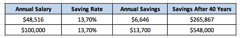 But let’s be optimistic and consider a 13,7% savings rate. The average salary in the US is $48,516 per year. This means that after a whole year of savings, you will have $6,646 in your bank account. If you work for 40 years, by the time you retire, you will have saved $265,867. Not a bad figure, but when you consider that this is the result of a whole life of working and saving… it’s far from ideal.